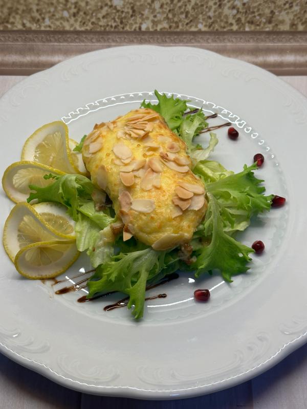 (филе трески под сыром в миндальной панировке, салатный микс)
