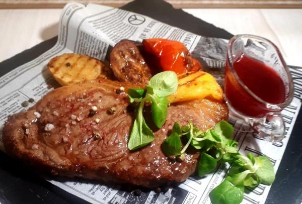 (мраморный стейк с овощным гарниром и фирменным соусом)
