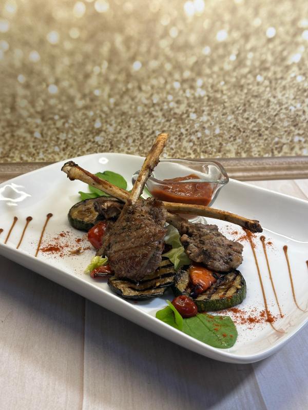(каре ягненка, овощи гриль, соус «Домашний»)