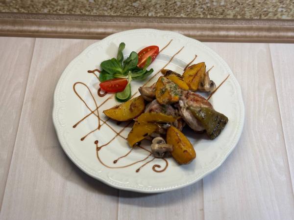 (три медальона из свиной вырезки в беконе, с грибами, картофелем, болгарским перцем)